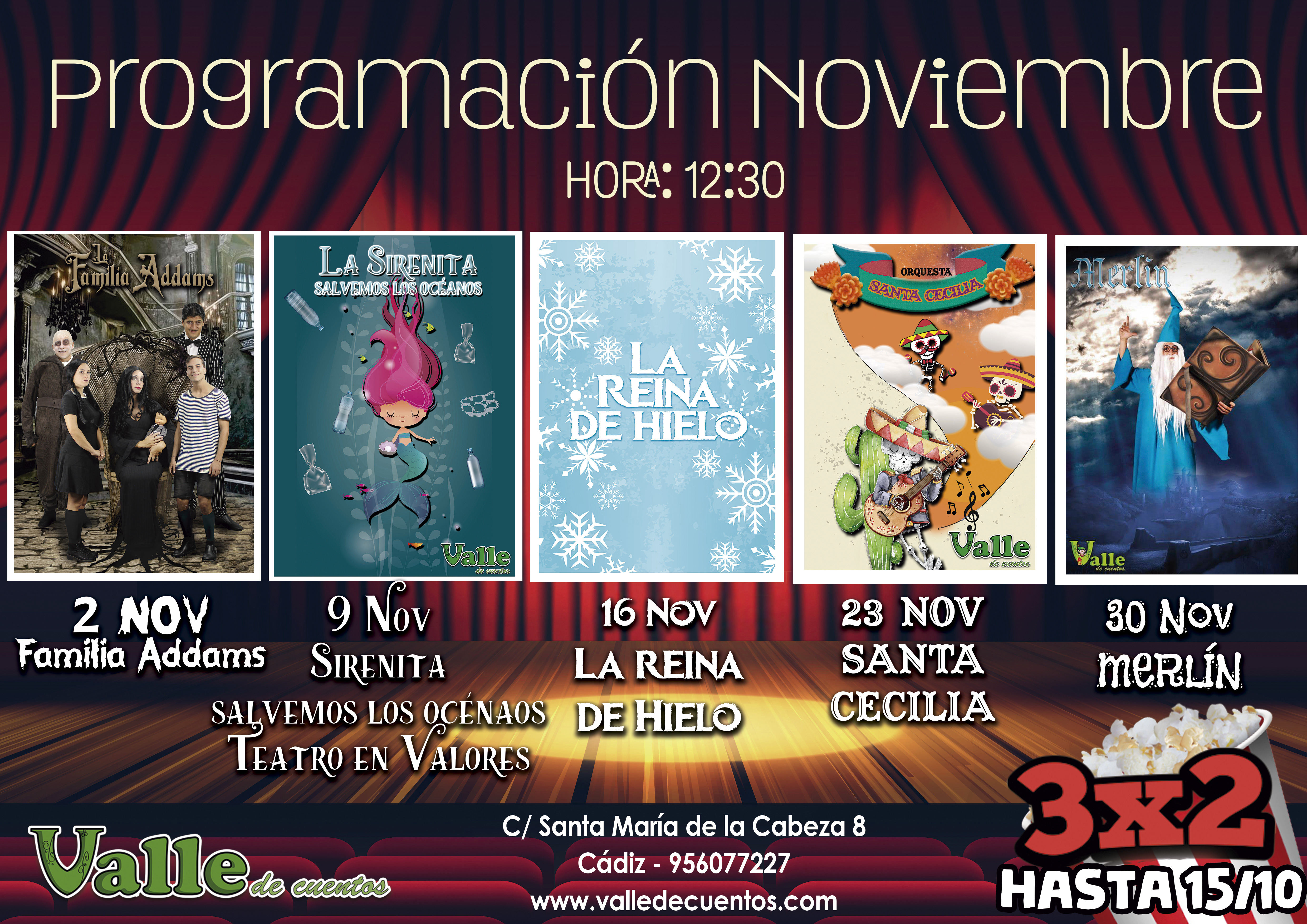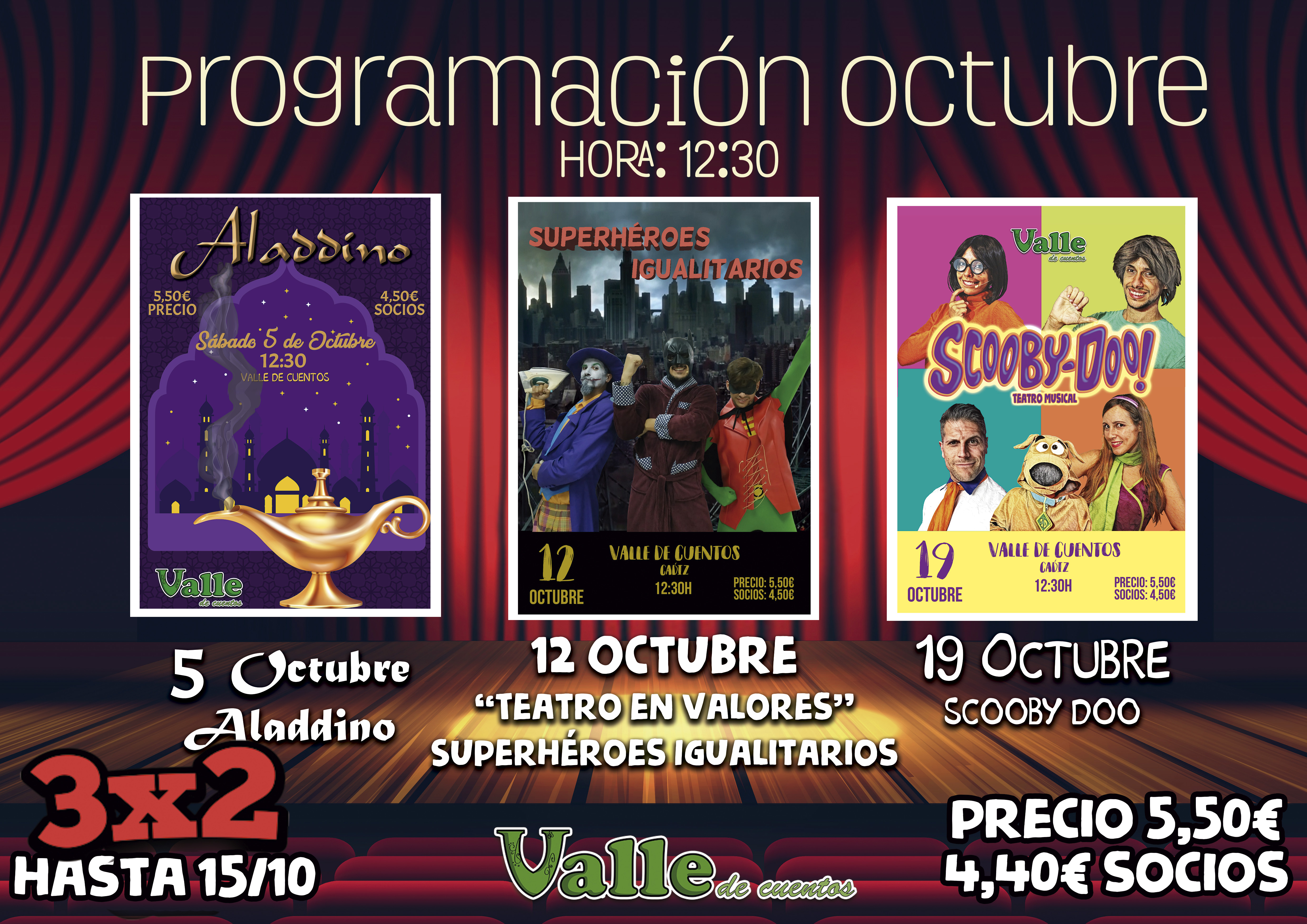 Cada Sábado de Octubre y Noviembre podréis disfrutar en familia de un teatro Valle de Cuentos, tendrán lugar en nuestro local (Calle Santa María de la Cabeza 8) a las 12:30. Pero es que lo mejor es que solo cuesta 5,50€ (4,50€ para los socios) y además, hasta el 15 de OCTUBRE podréis aplicaros al descuento del 3×2. ¡Llévate 3 entradas de la misma función y paga solo 2!