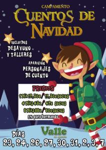 Y se llamará nada más y nada menos que «Cuentos de Navidad» y es que Valle de Cuentos es el mejor lugar donde pasar estos días no lectivos… ¿Que por qué? Pues sencillamente porque tendremos una programación llena de talleres y personajes de cuentos. Serán los días 23, 24, 26, 27, 30, 31, 2, 3 y 7 y lo mejor de todo son las super ofertas que tenemos.