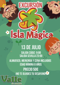 Tendrá lugar el día 13 de Julio. Salida de Cádiz a las 9:00 y salida de Isla Mágica a las 23:00. Es decir, todo un día de diversión a tope.