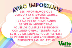 Les informamos que debido a la situación actual, a partir de ahora, Las tarifas de cumpleaños se verán modificadas. aquellos cumples reservados con anterioridad tendrán hasta el 15 de marzo para poder respetar el precio ofertado anteriormente